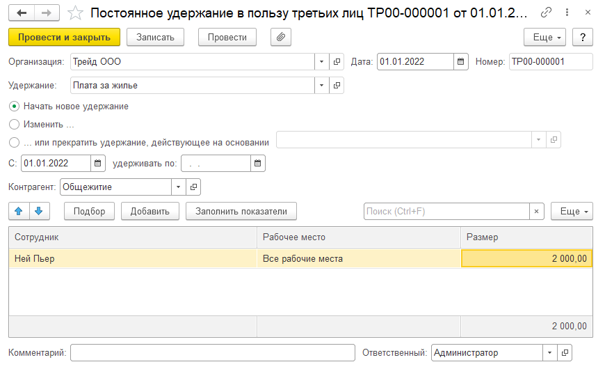 Сумма оплаты постоянная и составляет 2000 руб. в мес., контрагент – Общежитие (контрагента следует добавить в одноименный справочник). Введем данное удержание в программу как постоянное, т.е. без указания даты окончания действия удержания.