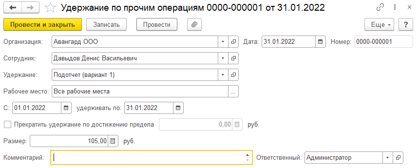 Из заработка сотрудника ООО "Авангард" Давыдова Д.В. производится удержание невозвращенной подотчетной суммы за январь 2022 в размере 105 руб. Введем удержание в счет расчетов по прочим операциям.