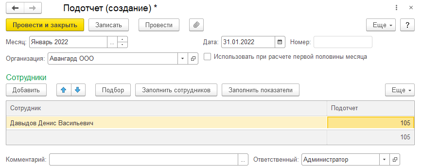 - заполняем сотруднику разовую сумму показателя "Подотчет" – результат также, как и при первом варианте, в итоге отразится в документе "Начисление зарплаты и взносов".