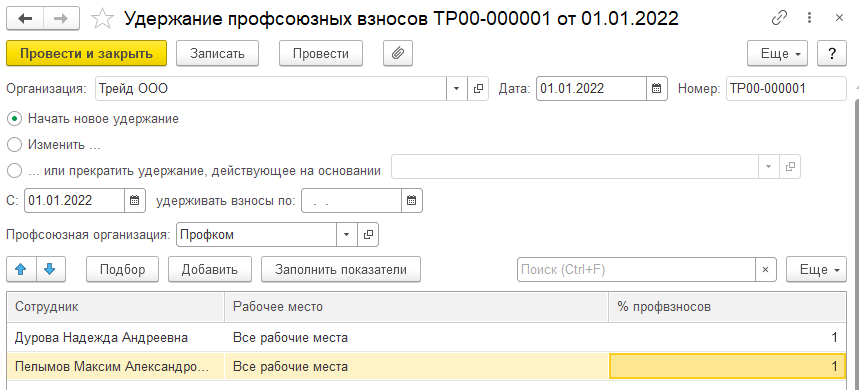 1. Профсоюзные взносы удерживаются у Дуровой Н.А. и Пелымова М.А. в размере 1% с января 2022.