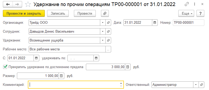 Сотрудник попросил удержать не всею сумму сразу, а распределить ее на три месяца (т.е. удерживать по 1000 руб. в месяц). Введем данное удержание как постоянное с учетом ограничения.