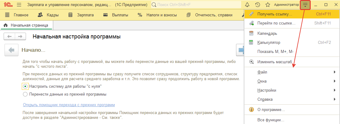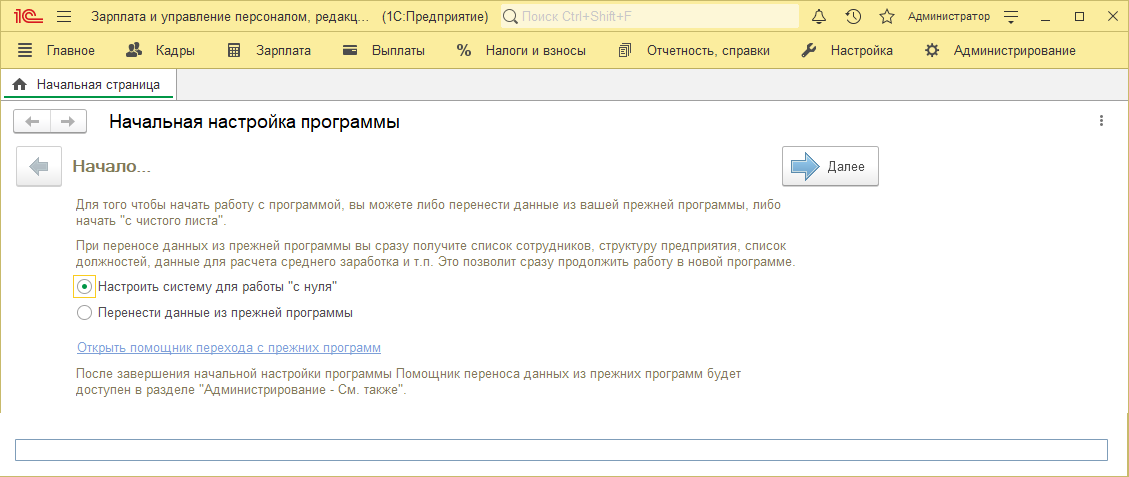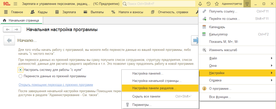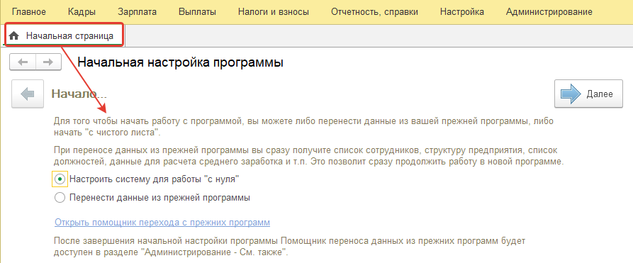 Кроме того, при открытии программы обычно запускается начальная страница. Начальная страница для пользователя с полными правами при первом запуске программы представляет собой стартовый помощник. При последующих запусках здесь будет отображаться один из инструментов работы, в зависимости от основной роли пользователя – кадровик, расчетчик.