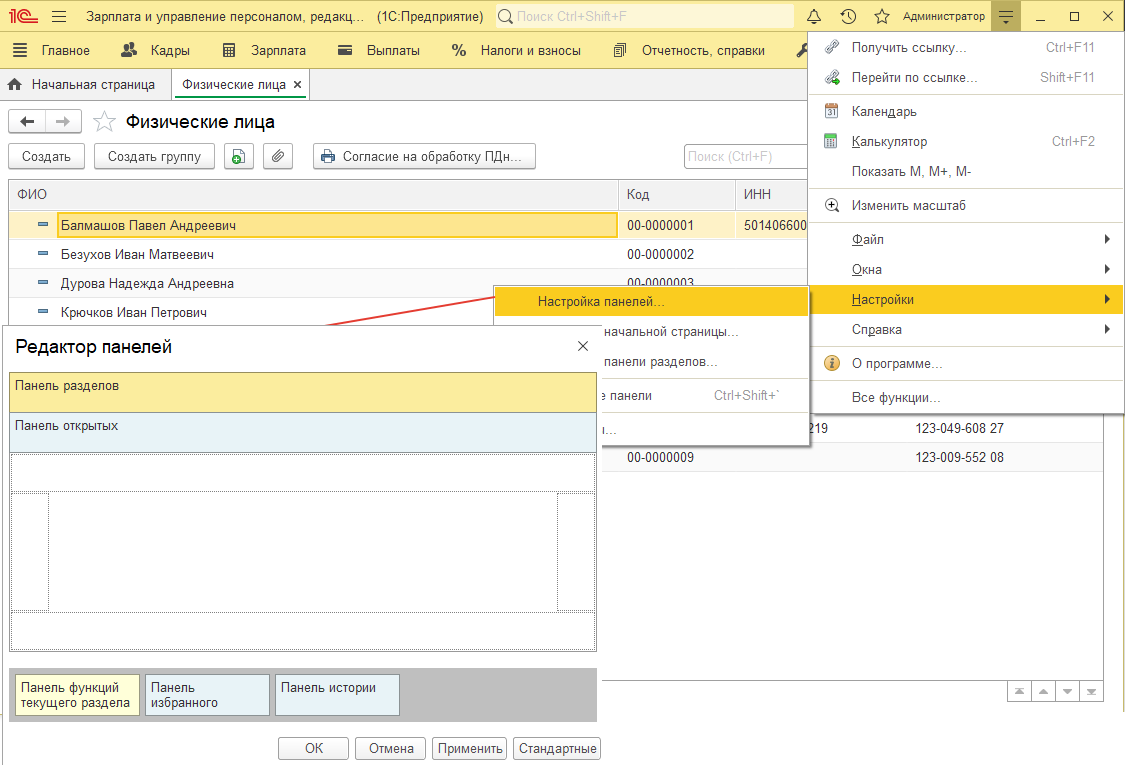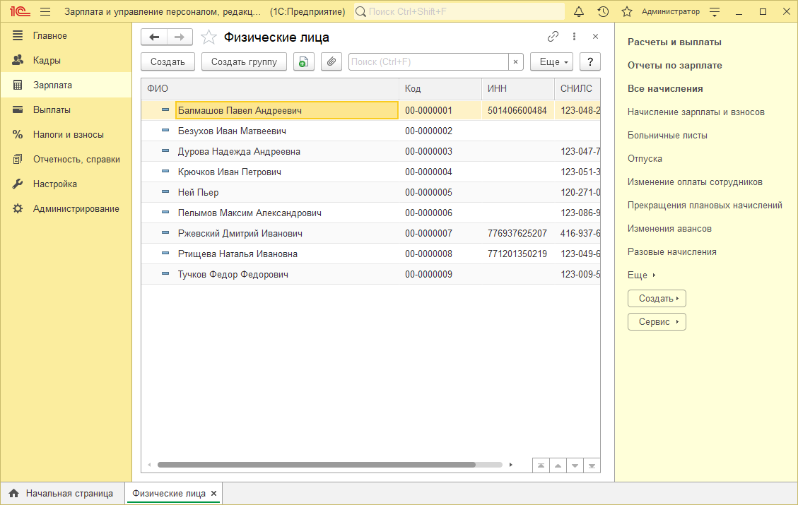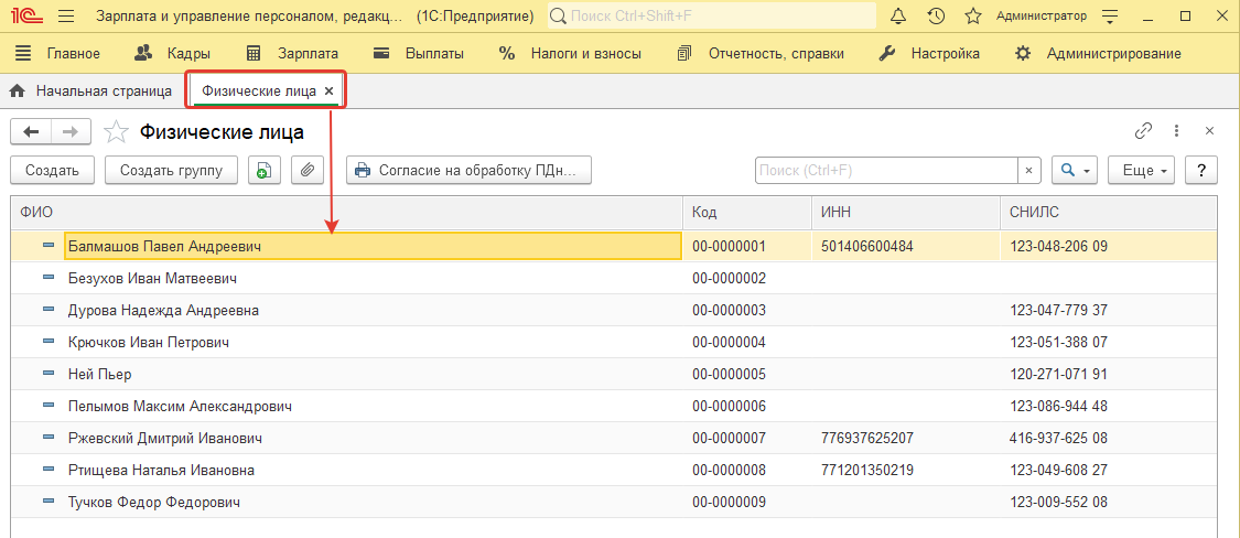 Рабочая область располагается под панелью открытых окон. Так, например, выглядит открытый справочник "Физические лица".