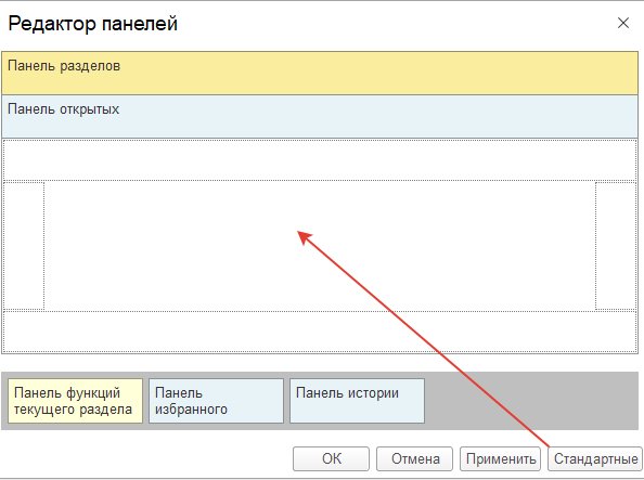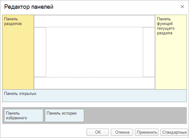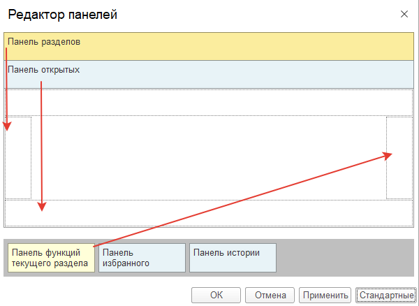 В редакторе поочередно изменим расположение панелей. Для этого требуется: выбрать соответствующую панель левой клавишей мыши и, не отпуская, перенести в иное место на схеме окна: панель разделов – влево, панель открытых вниз, панель функций текущего раздела – с серого поля вправо.