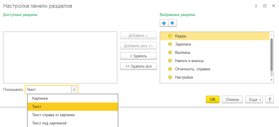 Настроить внешний вид панели разделов, а также видимость тех или иных разделов в рамках прав пользователя можно по команде "Сервис и настройки / Настройки / Настройка панели разделов".