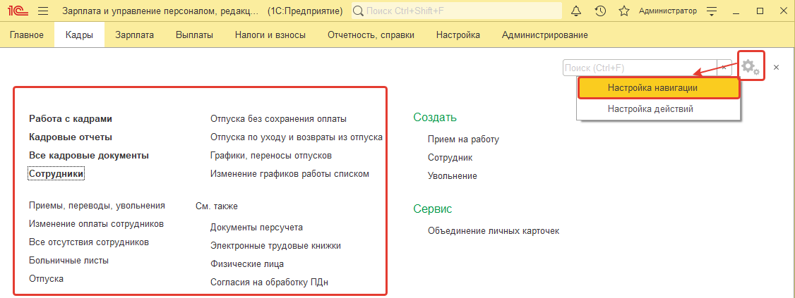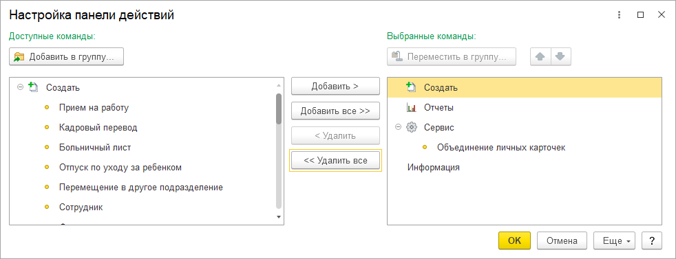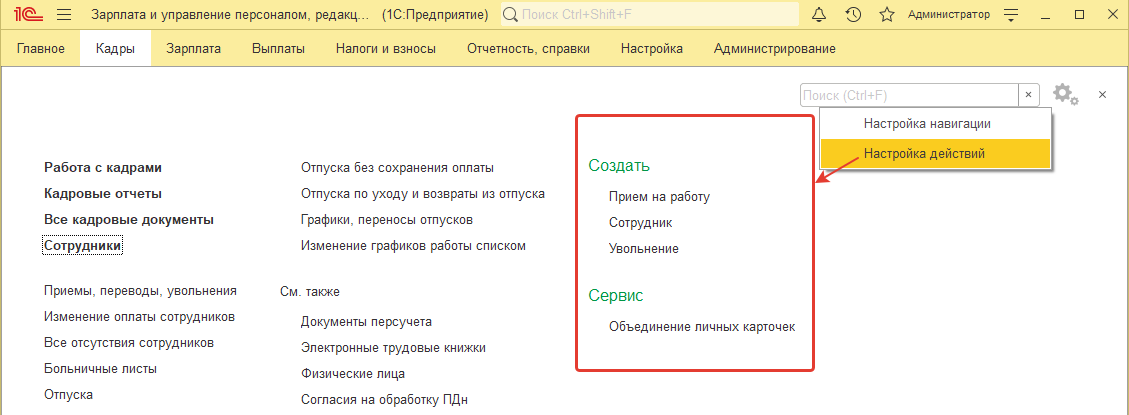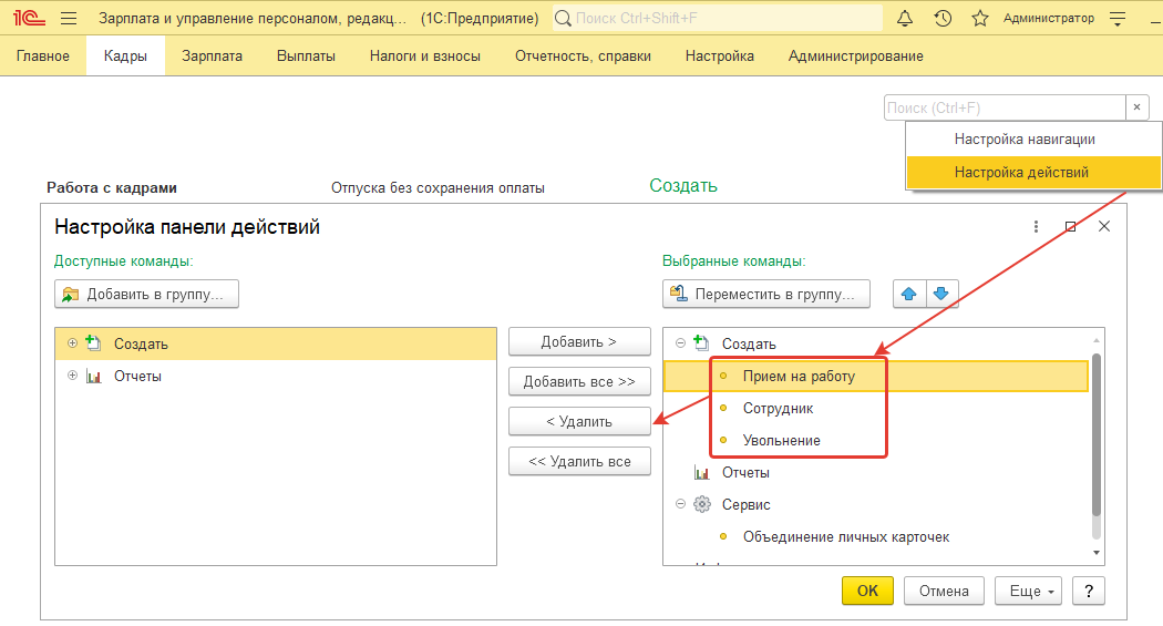 Изменим настройки действий в разделе "Кадры". Требуется очистить панель действий (пользователь решил упростить внешний вид раздела). Для этого перейдем в данный раздел и выберем команду "Настройка / Настройка действий", из левой части блока "Создать" перенесем все объекты в правую (кроме сервисных возможностей).