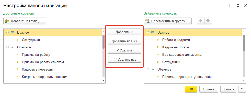 Панель навигации пользователь также может настраивать отдельно для каждого раздела по команде "Настройка навигации": добавлять команды в раздел "Важное" (выделяется жирным цветом), обычное, и дополнительные данные (См. также).