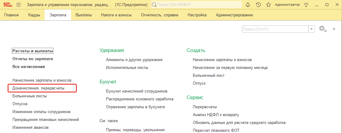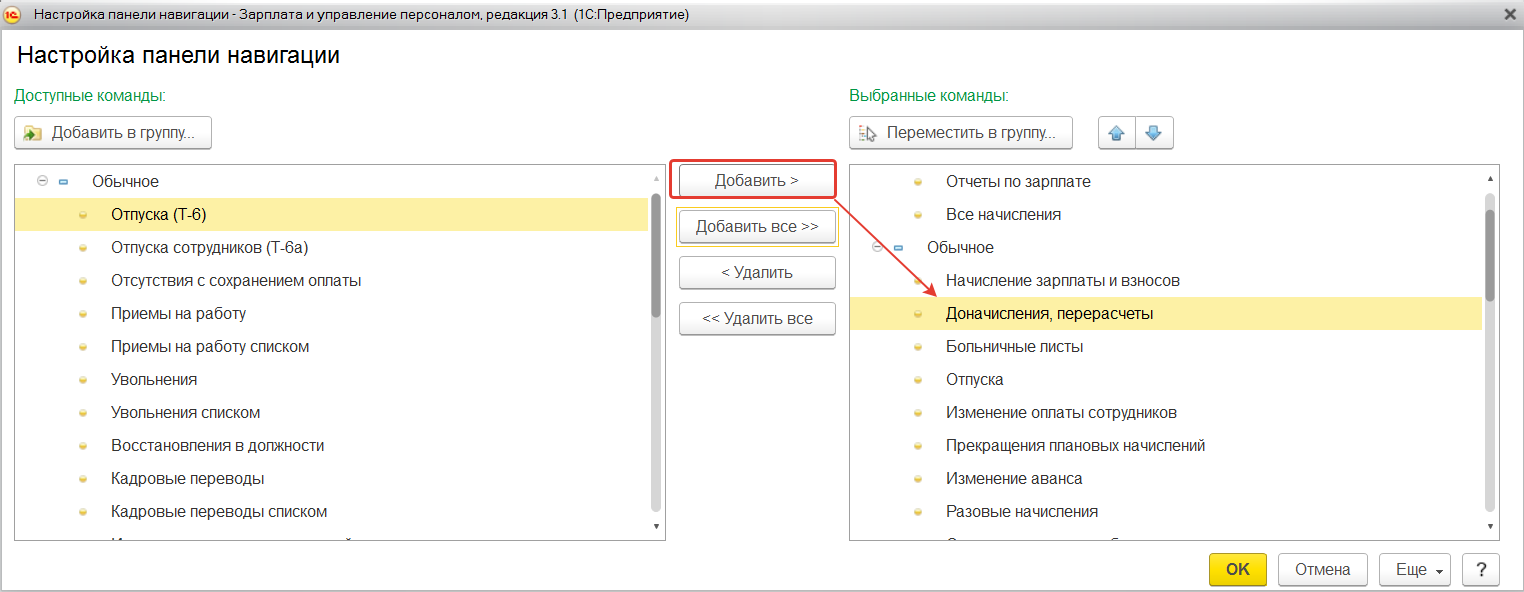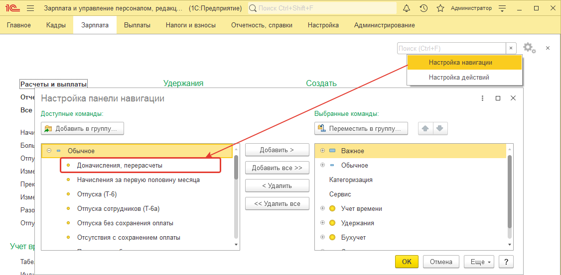 Требуется добавить в навигацию данного раздела документ "Доначисления, перерасчеты". Для этого перейдем в данный раздел и нажмем команду "Настройка / Настройка навигации". Найдем в левой части указанный объект.