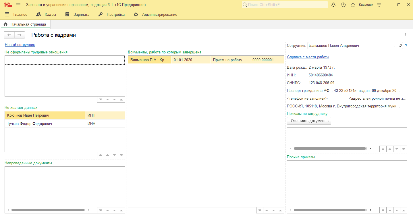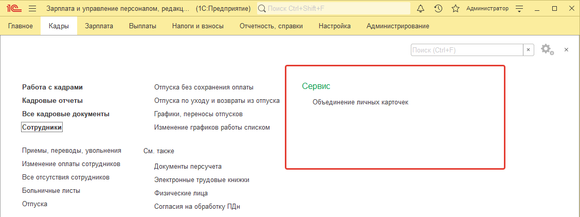 Следует обратить внимание, что если запустить программу под пользователем с ограниченными правами, то внешний вид окна и экранных форм ее объектов также может быть другим. Например, под пользователем с правами старшего кадровика окно программы по умолчанию выглядело бы так, как на рисунке далее.