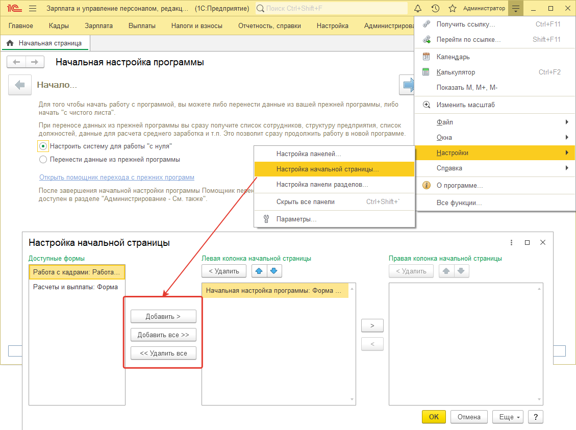 Настроить начальную страницу можно по команде "Сервис и настройки / Настройка / Настройка начальной страницы".
