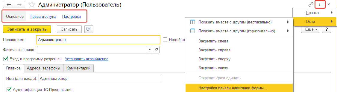 У экранной формы объектов программы (справочников, документов) также может собственная панель навигации. Ее настройка возможна, когда требуемая экранная форма открыта и имеет какую-либо навигацию, по команде "Меню (формы) / Окно / Настройка панели навигации формы".