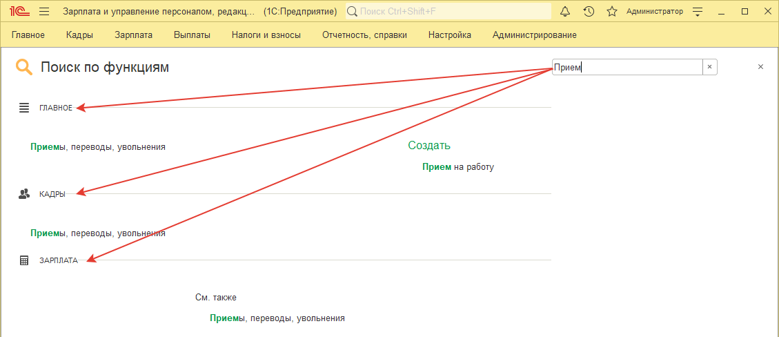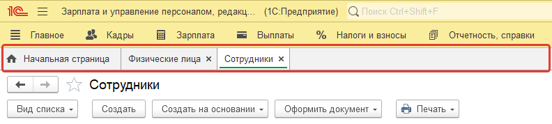 В каждом разделе может быть настроена собственная панель действий, содержащая наиболее часто используемые пользователем команды. Например, при нажатии на команду "Создать / Прием на работу" откроется новый чистый документ прием на работу, готовый для заполнения (а не список всех приемов на работу).