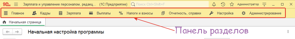 Выбор того или иного режима не влияет на функциональность программы (т.е. не ограничивает доступ к объектам, не уменьшает /увеличивает возможности пользователя по расчету зарплаты и т.п.), только на отображение картинки на экране. В рамках курса используется режим "Такси" (настройки внешнего вида открывающихся форм изменяются по команде: "Сервис и настройки / Настройки / Внешний вид", однако рекомендуемым является именно режим "Такси", с которым мы и будем работать). Рассмотрим окно программы подробнее.