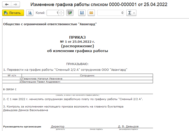В документ попадут сотрудники данного отдела, не работавшие по данному графику на дату изменения. Проведем документ. Выведем на печать приказ об изменении графика работы.