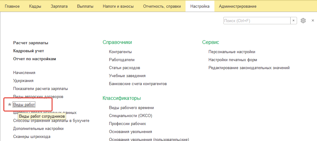 Перечень видов работ (услуг, единиц продукции и т.п.), за которые производится сдельная оплата, и расценки за эти работы указывается в справочнике "Виды работ". Он вызывается в разделе "Настройка".