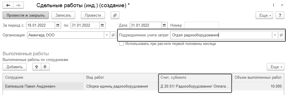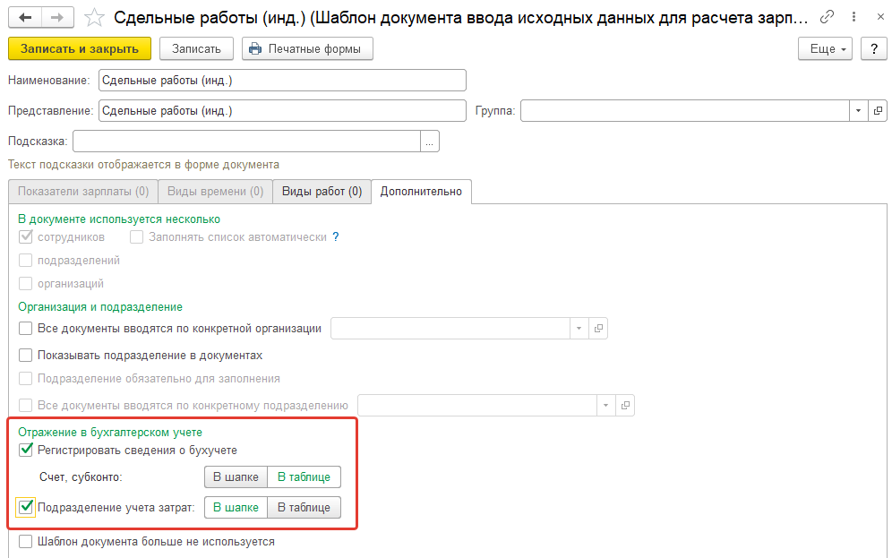 Обратите внимание на то, что у сдельной оплаты есть особенности отражения в учете. Они зависят от настроек шаблона по сдельным работам.