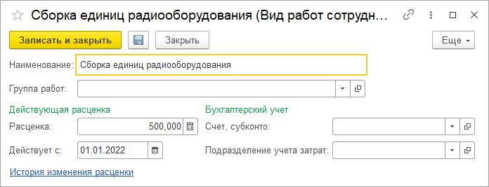 Справочник содержит перечень всех производственных технологических операций, применяемых в организации, и предназначен для учета оплаты сдельного труда. Для каждого вида работ, оплачиваемого сдельно, в справочнике указывается стоимость за единицу работ, действующая с определенной даты. В программе сохраняется история изменения расценок.