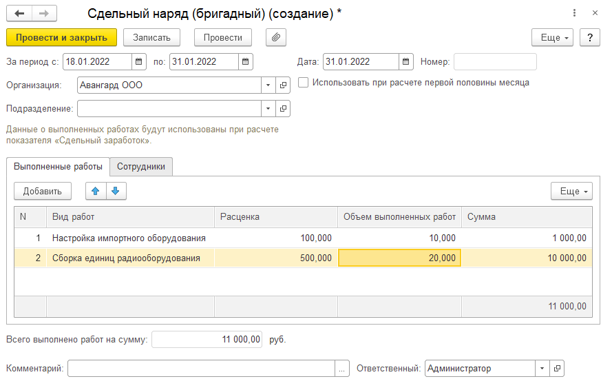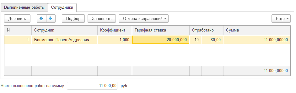 - Закладка "Сотрудник" – заполняются сотрудники, выполнявшие работы, сумма за выполненные работы распределяется между ними.
