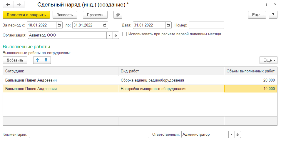 Напомним, что в нашей учебной базе сотрудником ООО "Авангард", работающим сдельно, является Балмашов П.А. (с 18.01.22). В разделе "Зарплата/ Данные для расчета зарплаты" создадим документ "Сдельные работы (бригадный)" (по типовому шаблону) для Балмашова П.А.