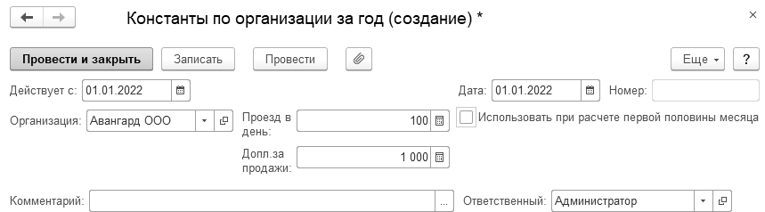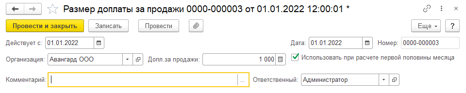- "Размер доплаты за продажи" – с 01.01.22 составляет 1000 руб. (за единицу сверх плана).