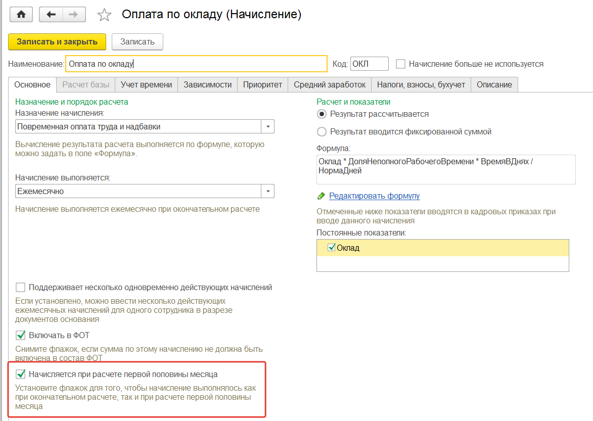 При расчете за первую половину используются те начисления и удержания, у которых в настройках установлен флаг "Начисление используется при расчете за первую половину месяца".
