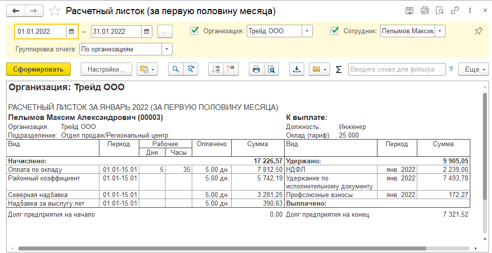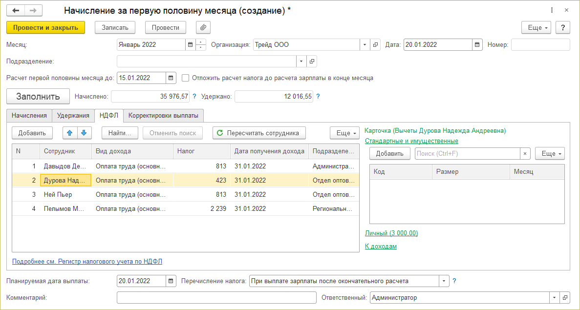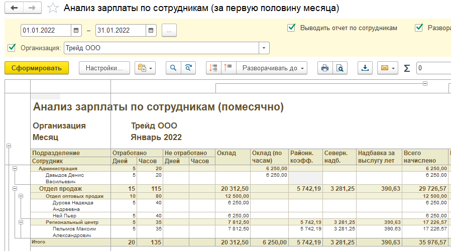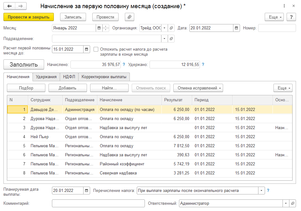 Обратите внимание: в документе учитываются те начисления, которые действуют в периоде по 15.01.2022 (например, постоянные надбавки, назначенные в конце месяца или кадровые переводы при заполнении по 15.01.2022 учитываться не будут). Также учитывается отработанное время в соответствии с графиком работы каждого сотрудника.