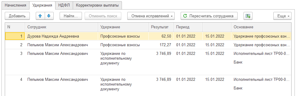 2. Проанализируем сумм удержаний, действующих с 01.01. по 15.01.