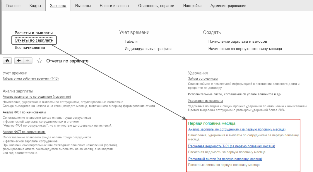 Проанализировать суммы, рассчитанные за первую половину месяца также можно с помощью отчетов. В разделе "Зарплата/ Отчеты по зарплате" есть группа отчетов по данным документов расчета первой половины месяца.