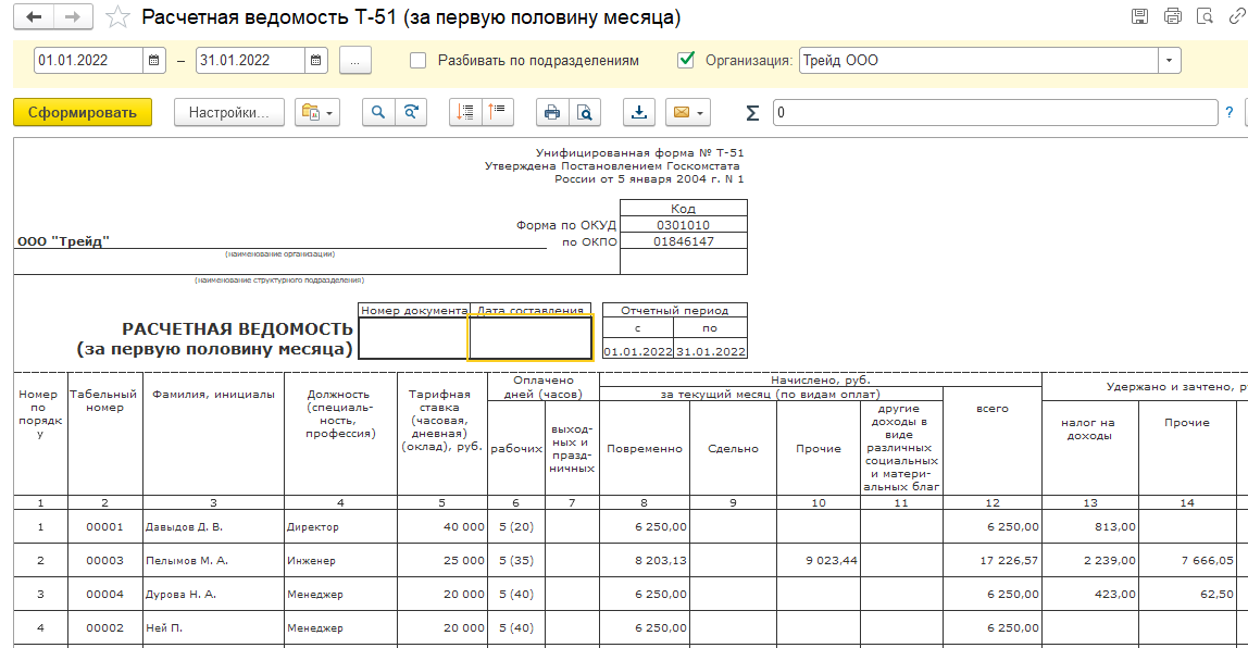 Отчет "Расчетная ведомость Т-51 (за первую половину месяца)" позволяет вывести унифицированную форму Т-51, в которой содержаться данные о расчетах по сотрудникам за первую половину месяца.