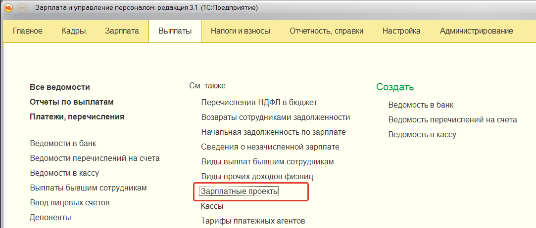 Справочник "Зарплатные проекты" доступен в разделе "Выплаты".