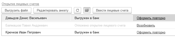 При этом в обработке формируется список сотрудников, для которых можно сформировать заявку на открытие счетов. Тем сотрудникам, которые не получают лицевые счета, следует поставить отметку – "Отложить".