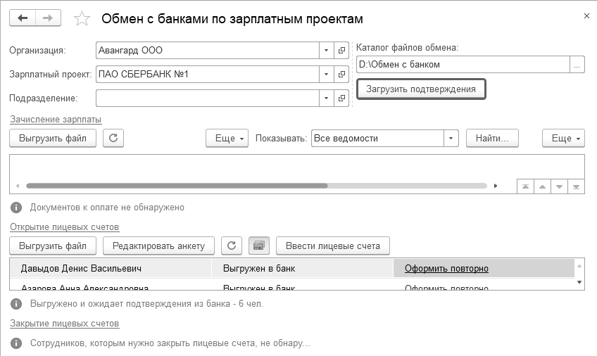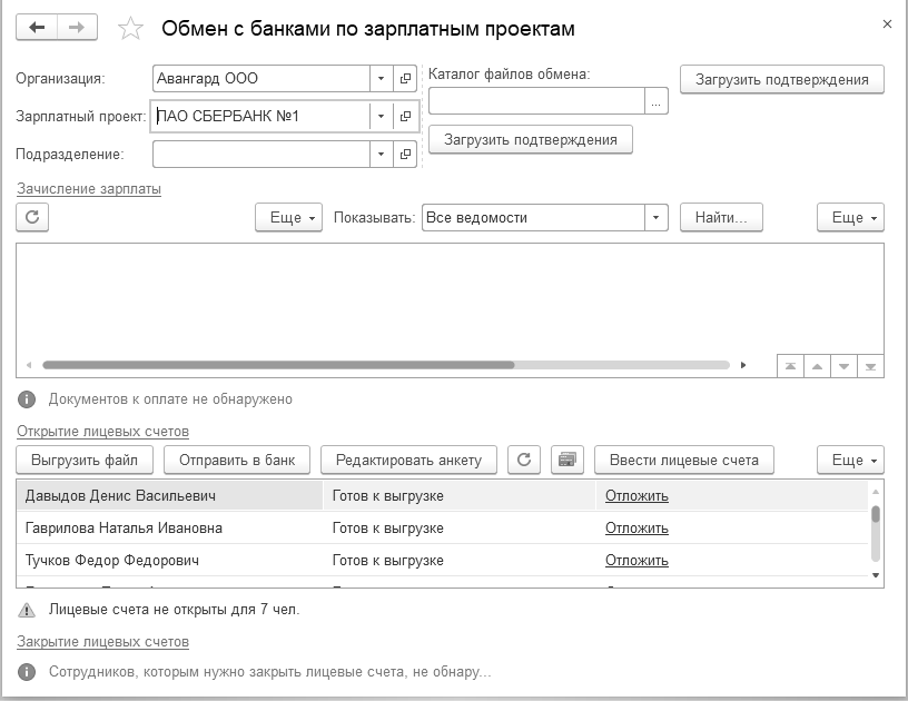 Основная часть сотрудников ООО "Авангард" будет получать зарплату через банк по зарплатному проекту. Отразим данную ситуацию в программе.