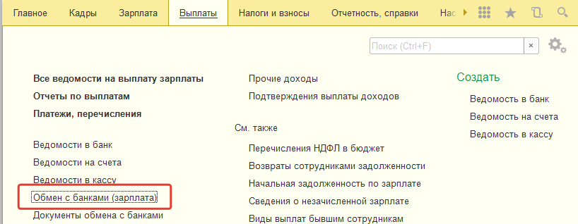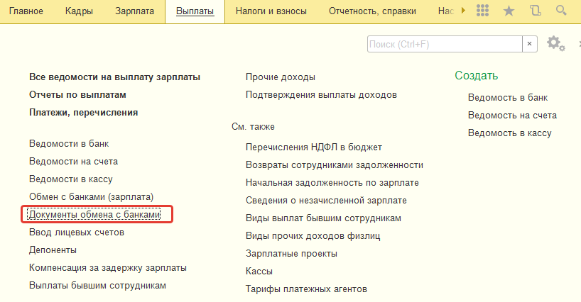 3) Выгружать файла на зачисление зарплаты и загружать сведения о зачисленной/незачисленной зарплате из банка (см. краткую справку далее – для документа "Ведомость в банк").