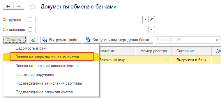 2) Обмениваться с банком заявками на закрытие счетов. Для этих целей создается заявка на закрытие счетов.