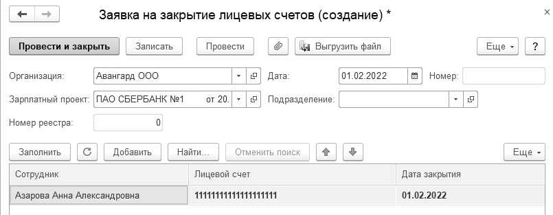 Документ на закрытие счета обычно автоматически заполняется для уволенных сотрудников.