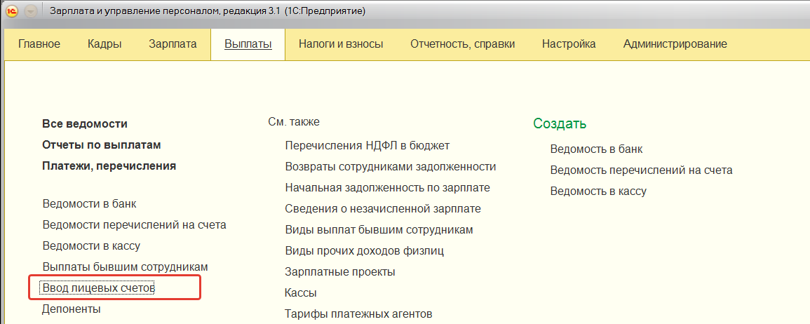 Эти способы применяются в том случае, если не используется электронный обмен с банком заявками на открытие/закрытие лицевых счетов. Форма "Ввод лицевых счетов" доступна из раздела "Выплаты / Ввод лицевых счетов" (блок по выплате на панели навигации).