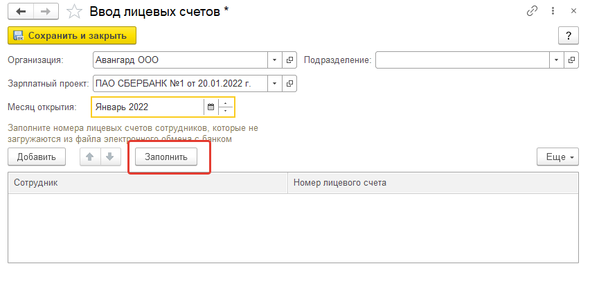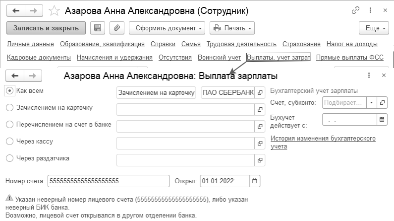 Сохраним и закроем форму ввода лицевых счетов – счета будут доступны в карточке сотрудника.