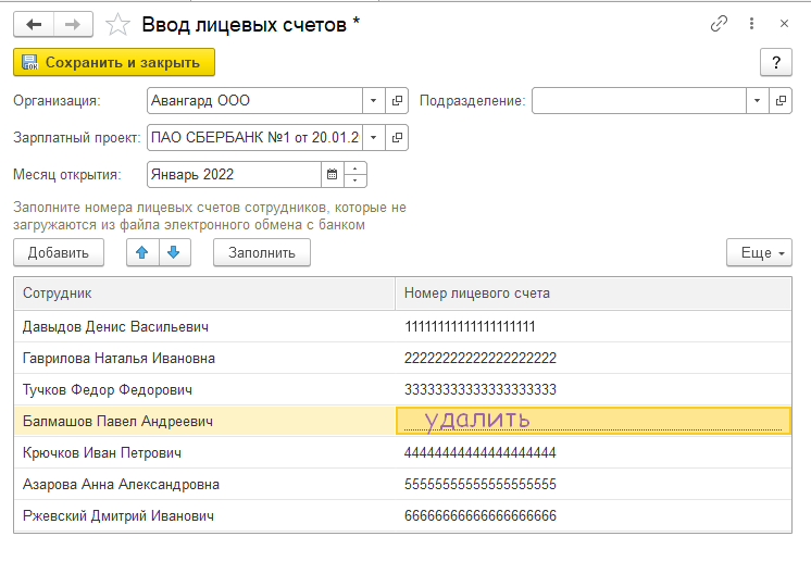 В рамках зарплатного проекта введем лицевые счета всем сотрудникам ООО "Авангард", кроме Балмашова П.А. Для этого в разделе "Выплаты / Ввод лицевых счетов" заполним форму ввода. Добавим в табличную часть всех сотрудников, кроме Балмашова П.А. Введем номера лицевых счетов вручную.