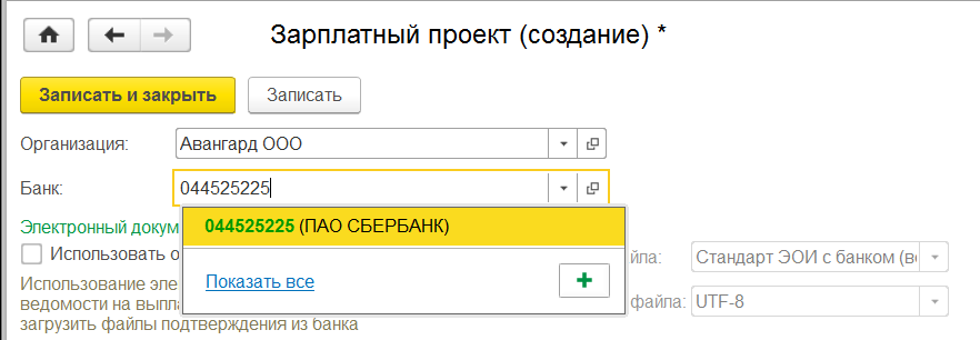 1. Добавим в справочник "Зарплатные проекты" новый зарплатный проект для Сбербанка (можно воспользоваться поиском по наименованию или по БИК 044525225).