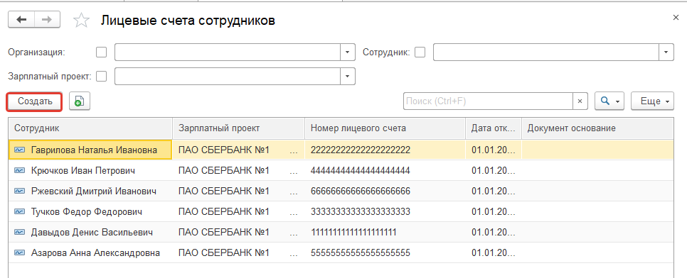 - Ввести лицевые счета сотрудникам в рамках зарплатного проекта.