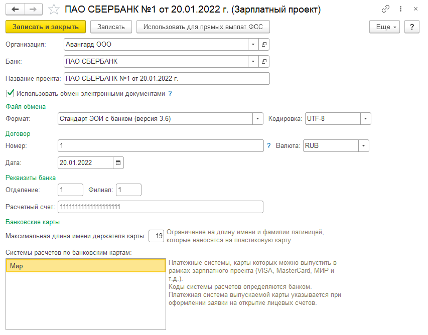 Поскольку в рамках учебной базы мы не сможем обмениваться электронными файлами с банком, то электронный обмен можно не использовать. При желании можно произвольно указать данные для электронного обмена. Запишем и закроем проект.