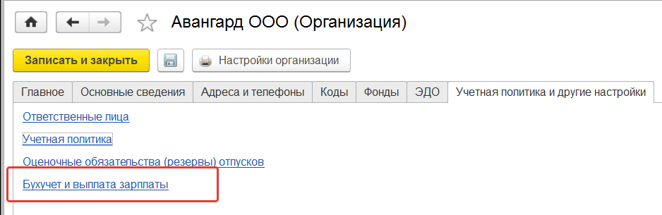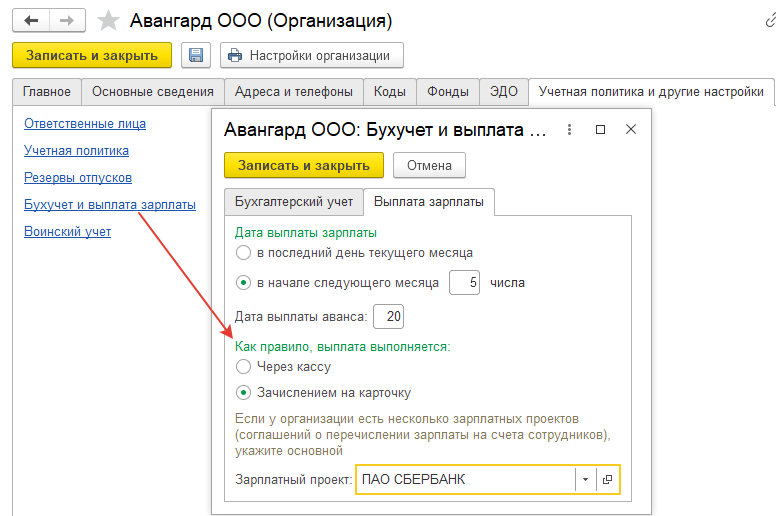 2. Настроим в карточке организации ООО "Авангард" на вкладке "Учетная политика и другие настройки" основной способ выплаты – по зарплатному проекту.