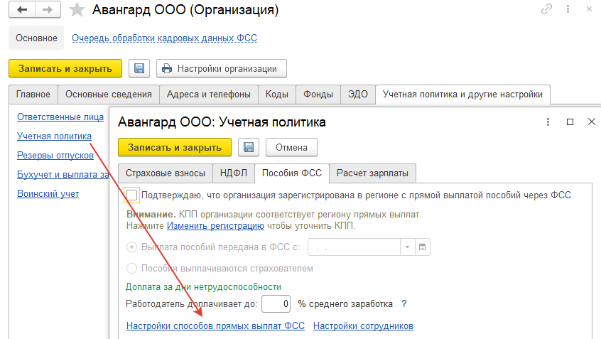 Перейдем к учетной политике организации – настройка пособий ФСС. В реальной базе можно было бы установить зарплатный проект в качестве основного способа перечисления пособий по умолчанию, однако в учебной базе мы, напротив, уберем данную настройку (поскольку лицевые счета проверяются при формировании реестров, а "учебные" лицевые счета такую проверку не пройдут).