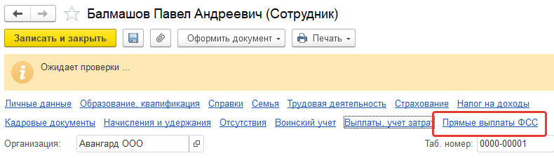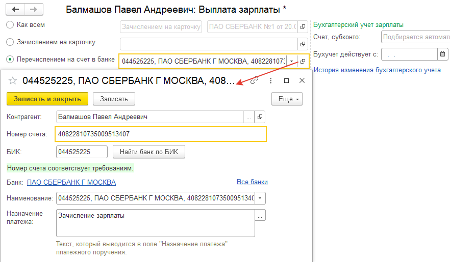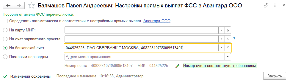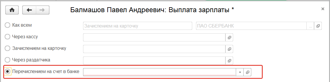 Изменим настройку для прямых выплат лично для данного сотрудника – на личный счет.