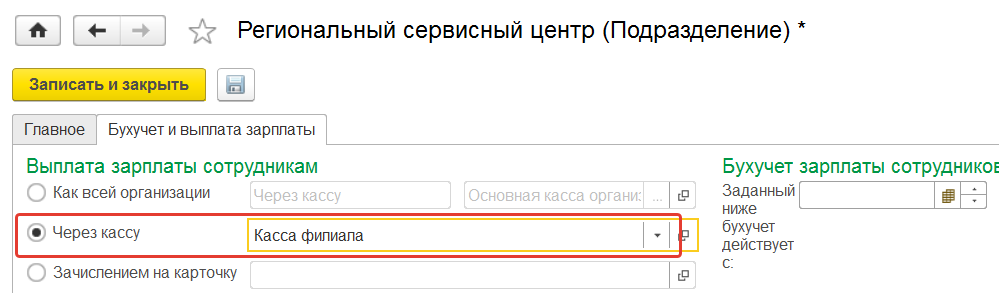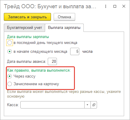 На закладке "Учетная политика и другие настройки" по ссылке "Бухучет и выплата зарплаты" проверим способ выплаты, т.к. касса в организации одна, то выбирать кассу не будем. Такой вариант настройки также удобен, если любой новый сотрудник, принятый в организацию, должен попадать в ведомость в кассу. В последующем, если выплаты перейдут на безналичный расчет, можно будет уточнить счет в карточке сотрудника.