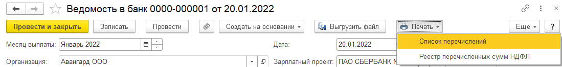 В документах указываются ответственные лица (руководитель и главный бухгалтер). Из формы документа можно распечатать список перечислений в банк (ссылка "Выплата зарплаты и перечисление НДФЛ" рассматривается далее отдельно).