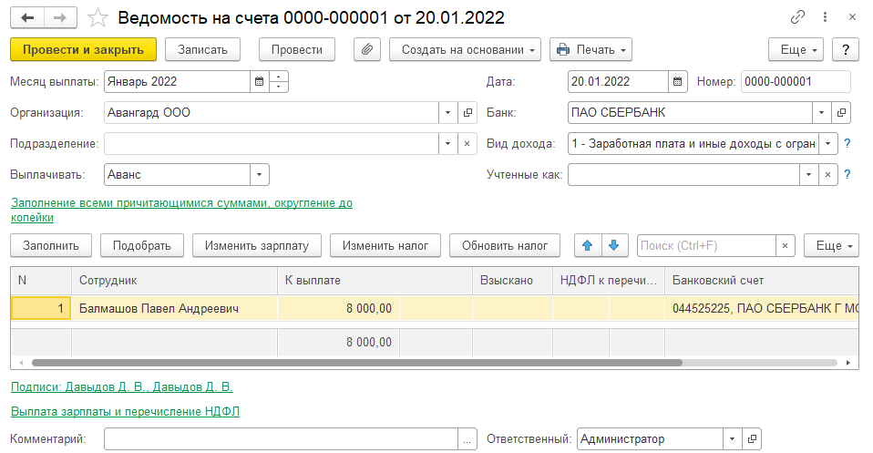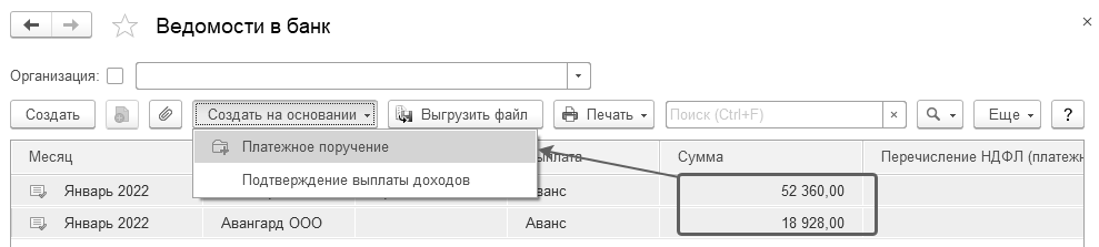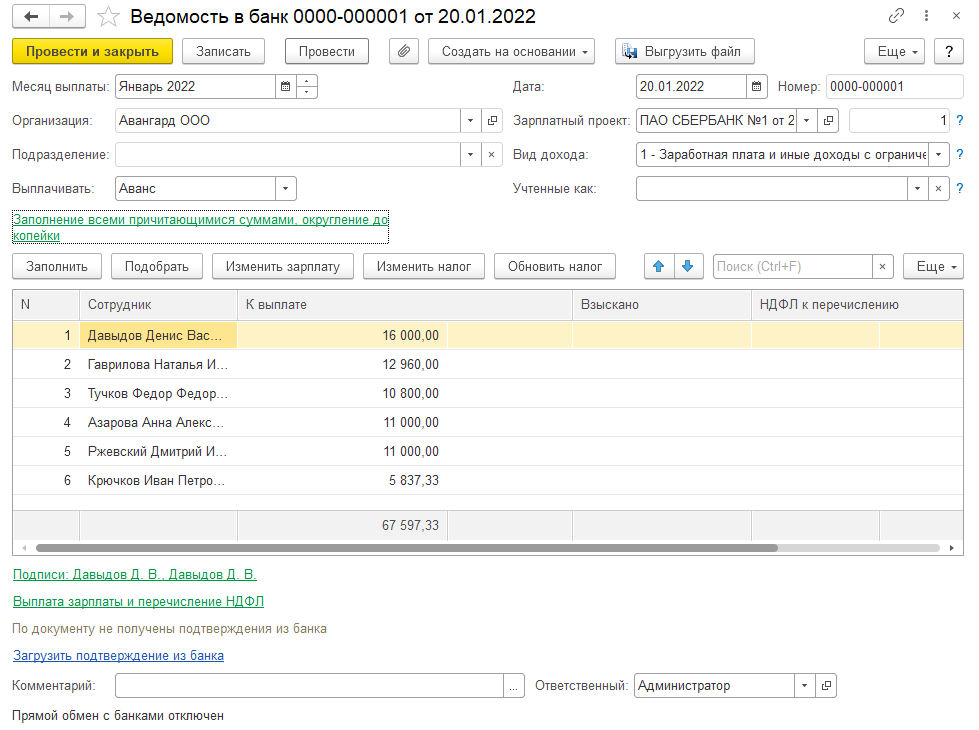 Создадим в разделе "Выплаты / Все ведомости" ведомость на выплату аванса через перечисление на индивидуальные счета для сотрудников ООО "Авангард":