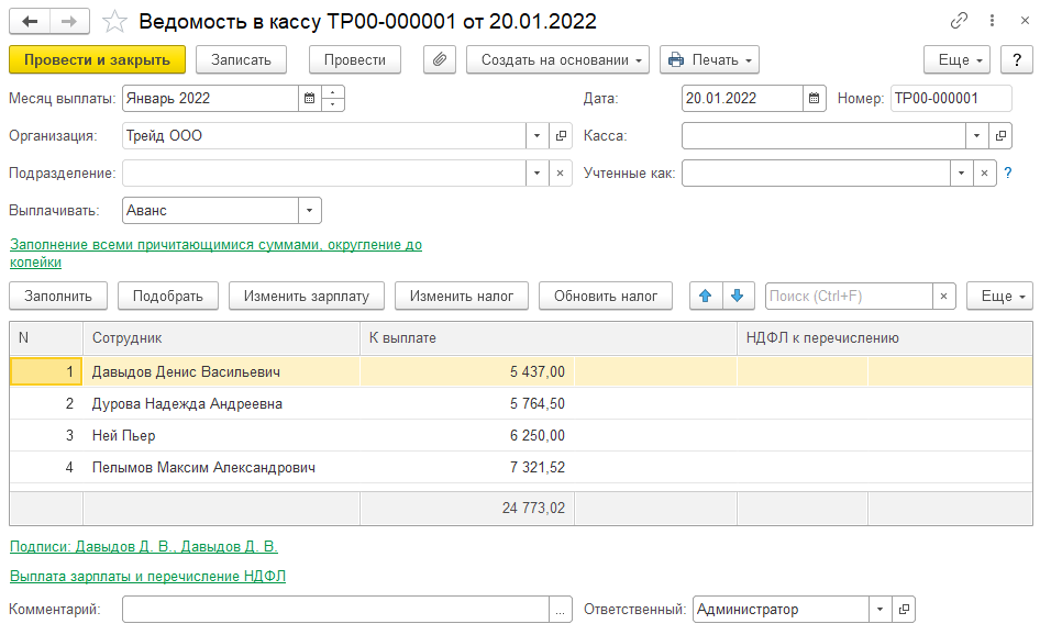 - Для сотрудников ООО "Трейд" – ведомости в кассу.