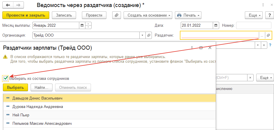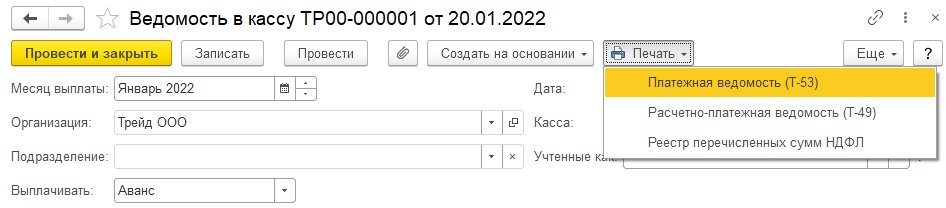 Создадим в разделе "Выплаты / Все ведомости" ведомость на выплату аванса через кассы для сотрудников ООО "Трейд": укажем дату документа 20.01.2022, выплата за январь. Заполним документ автоматически списком сотрудников, которые получают суммы в кассу (сверить суммы можно с расчетом в документе "Начисление зарплаты за первую половину").