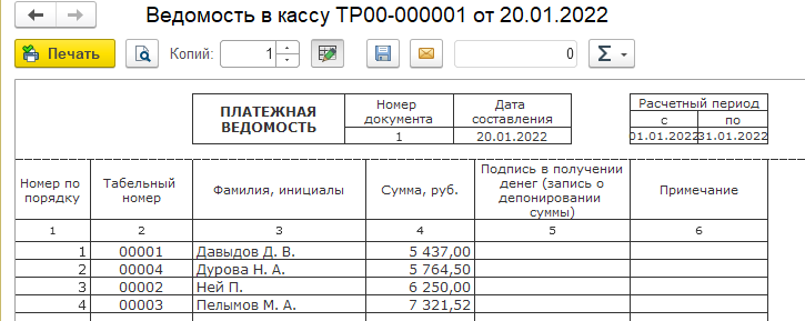 - Дата документа – дата подготовки ведомости на выплату; месяц начисления – месяц, за который выплачиваются суммы;